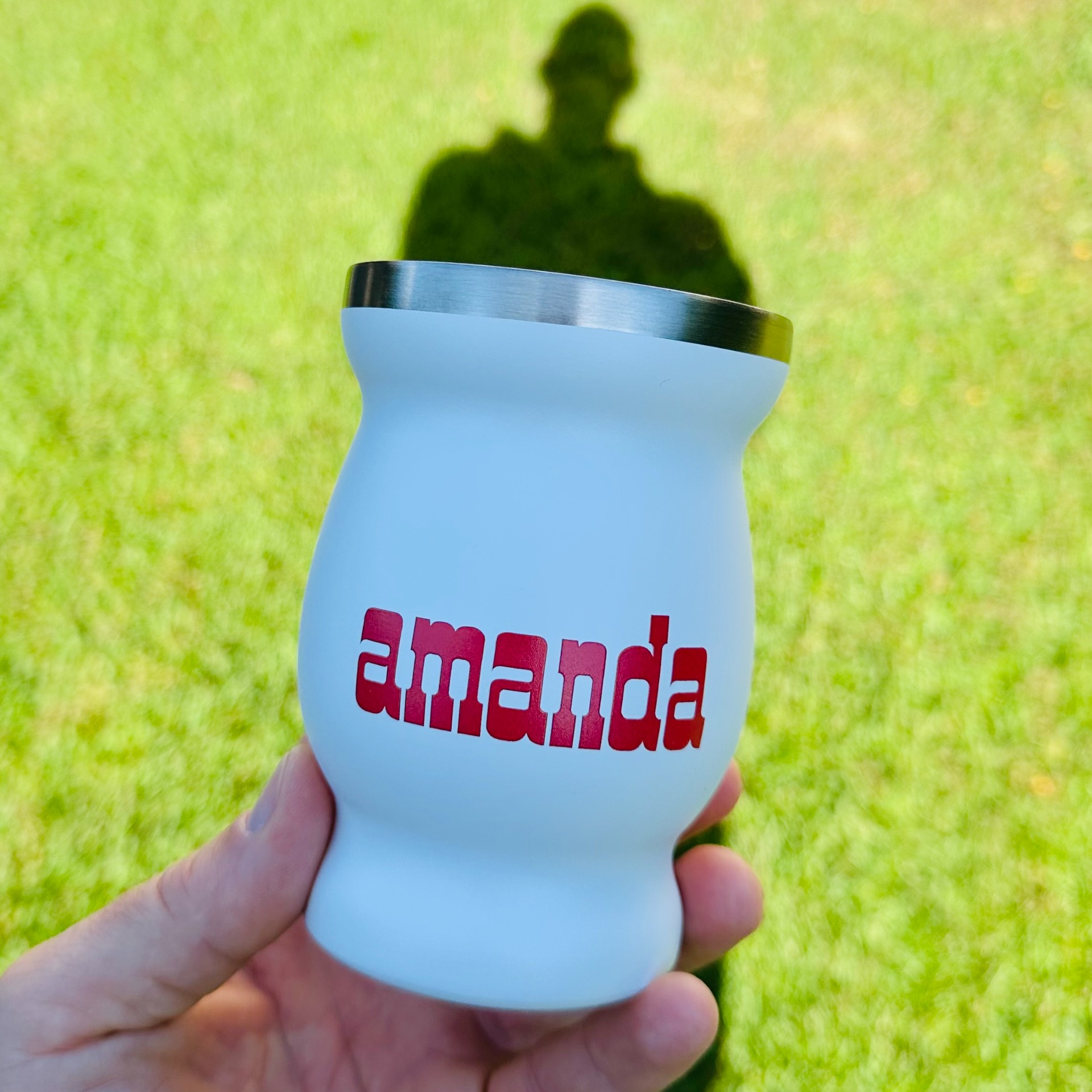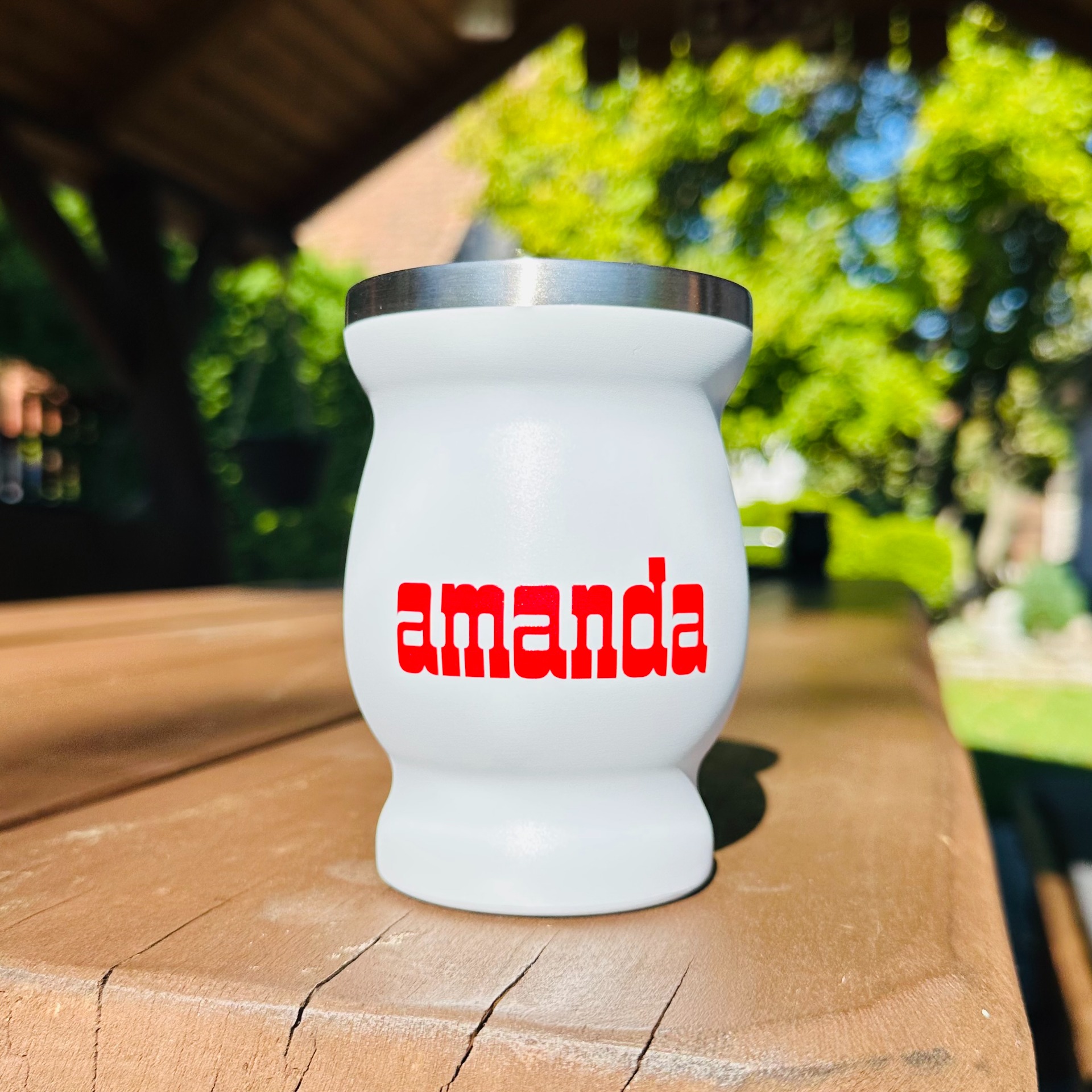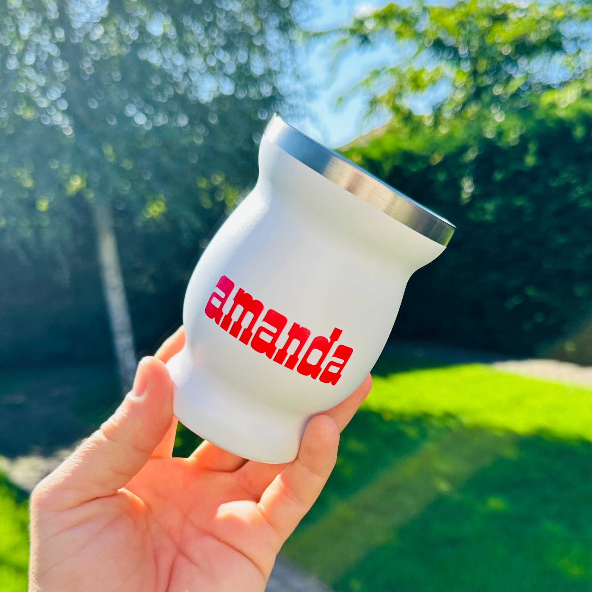 A mate élmény igazi koronája: a fehér alapon piros színnel logózott Amanda Rozsdamentes Calabasa. Elegáns, minimalista design, időtálló anyag és kifinomult forma – mindaz, amit egy prémium kiegészítőtől elvárhatsz.©
