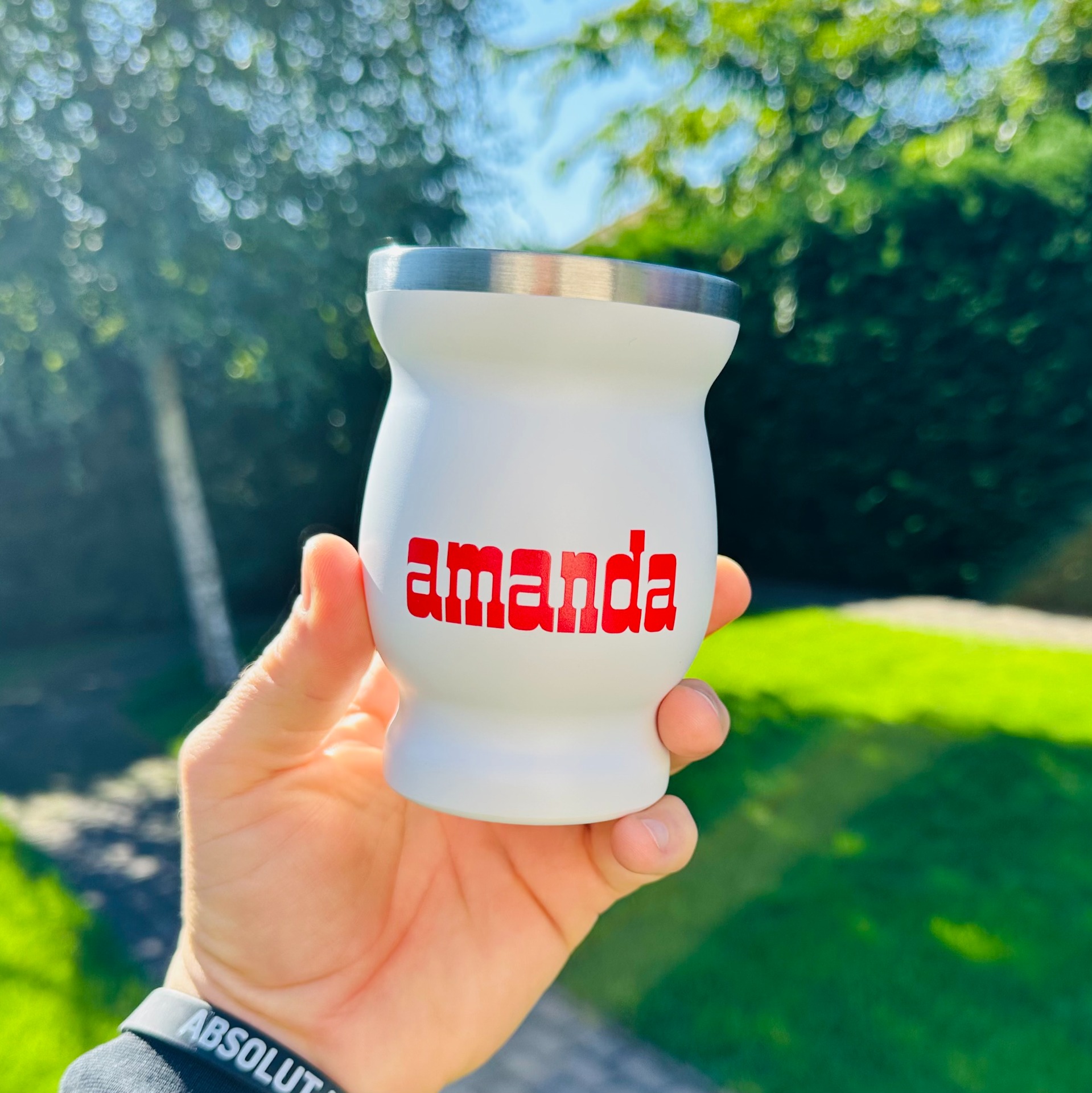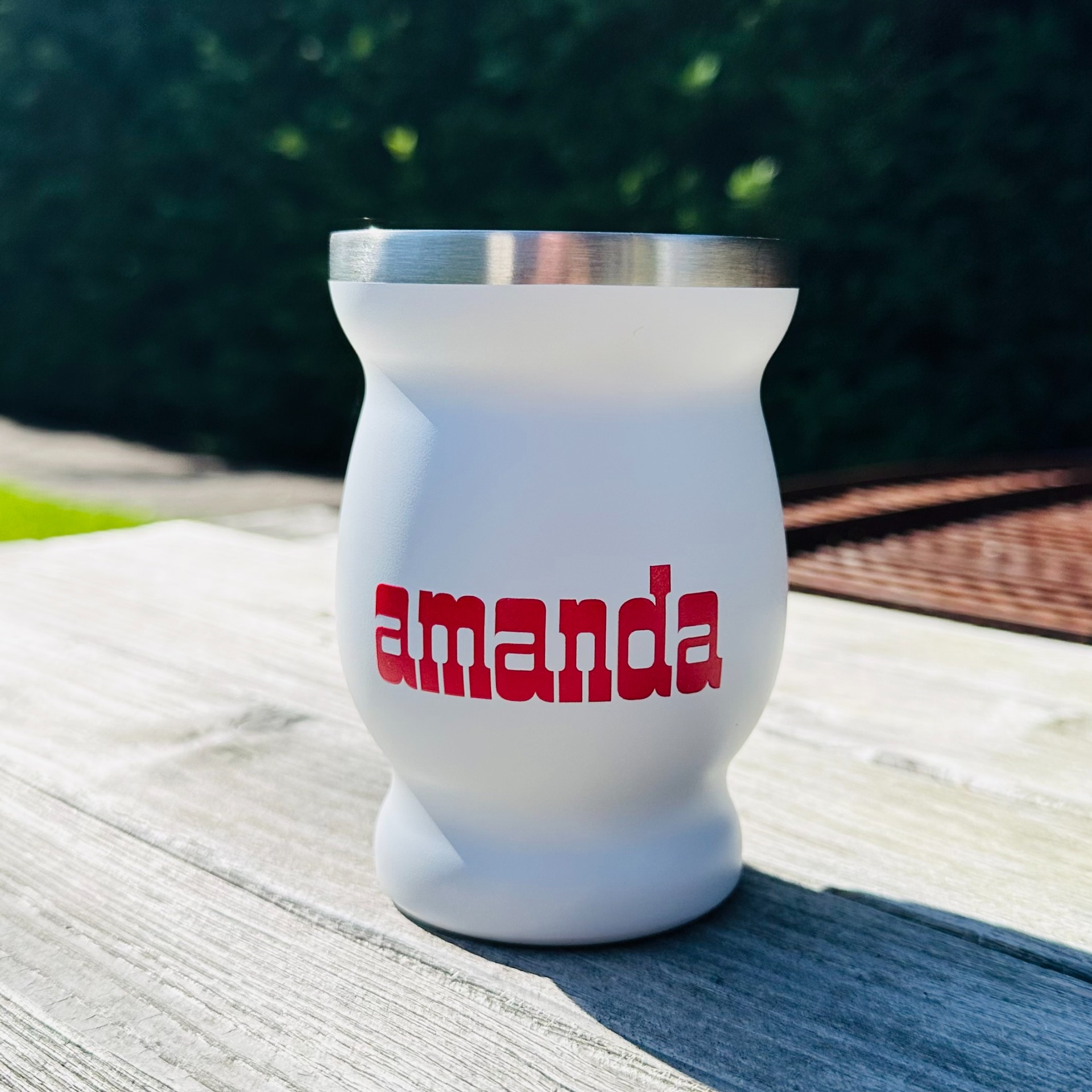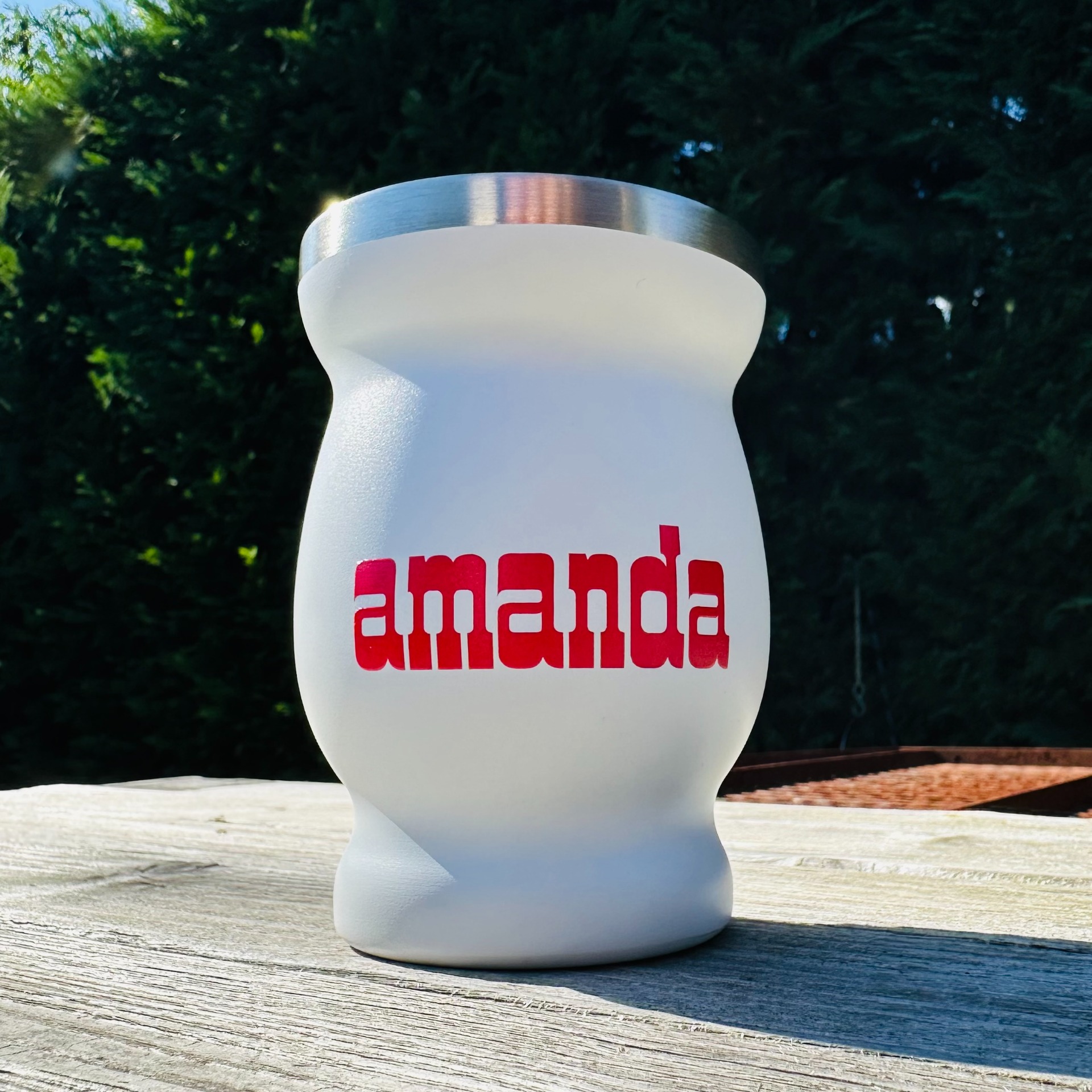 A mate élmény igazi koronája: a fehér alapon piros színnel logózott Amanda Rozsdamentes Calabasa. Elegáns, minimalista design, időtálló anyag és kifinomult forma – mindaz, amit egy prémium kiegészítőtől elvárhatsz.©