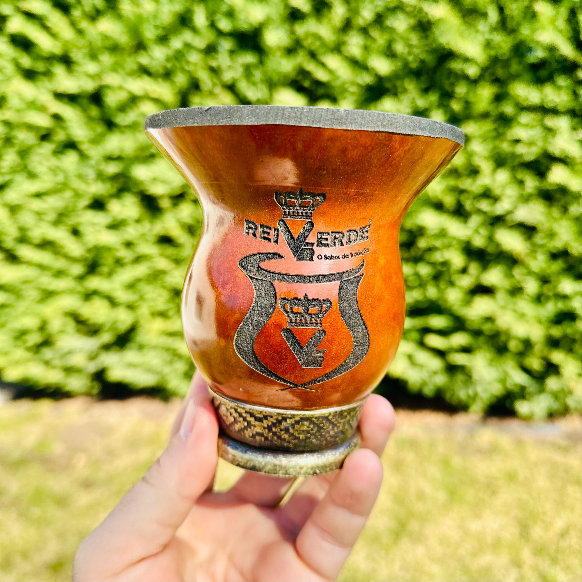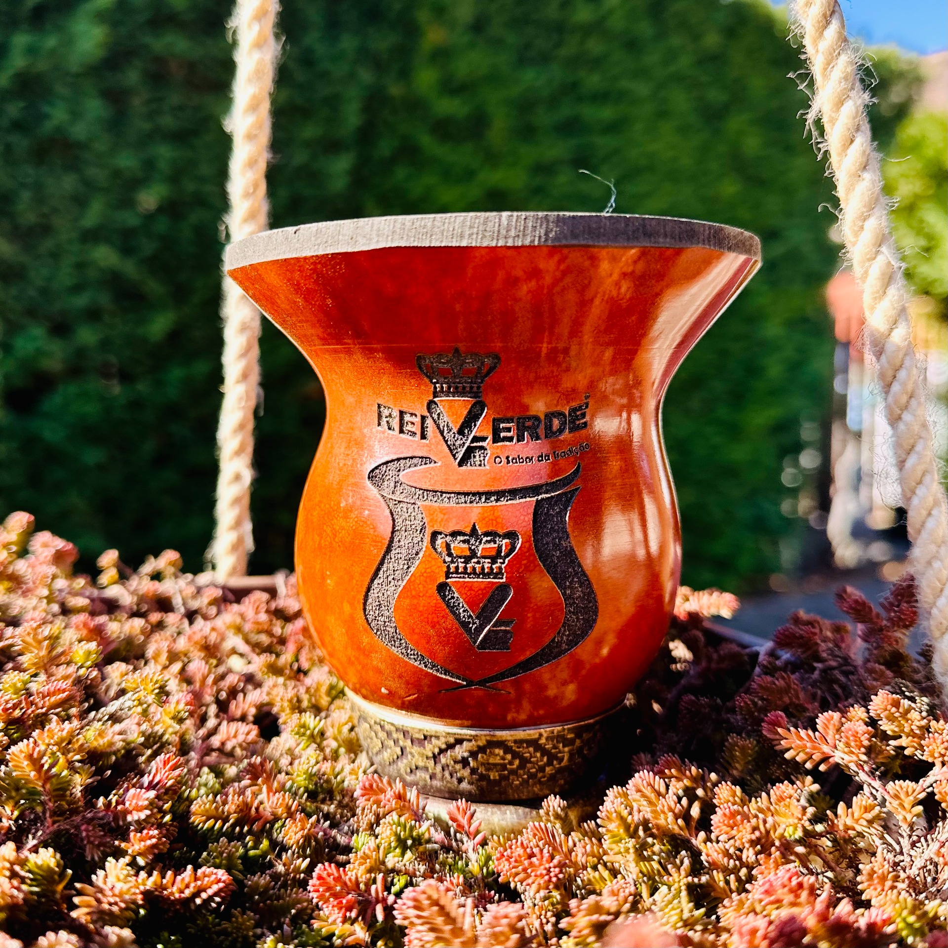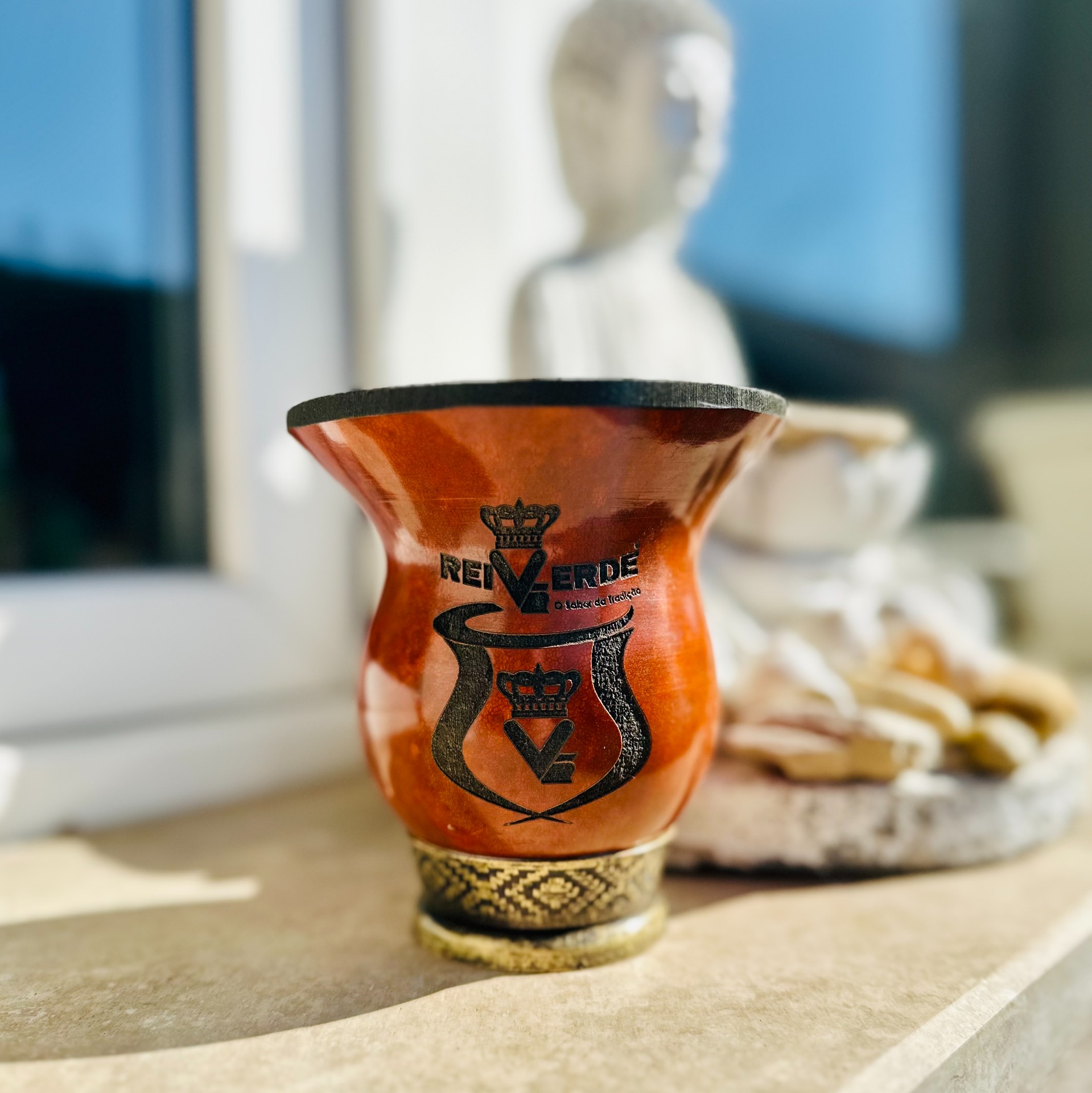 Ez a homokóra formájú Rei Verde Cuia vastag héjú tökből készült, stabil, díszített fém talppal. A Chimarrão nagy szerelmeseinek örömére, gondosan megalkotott, klasszikus déli formavilággal, és a márka égetett logójával ellátott egyedi darab – igazi különlegesség a materók számára!©