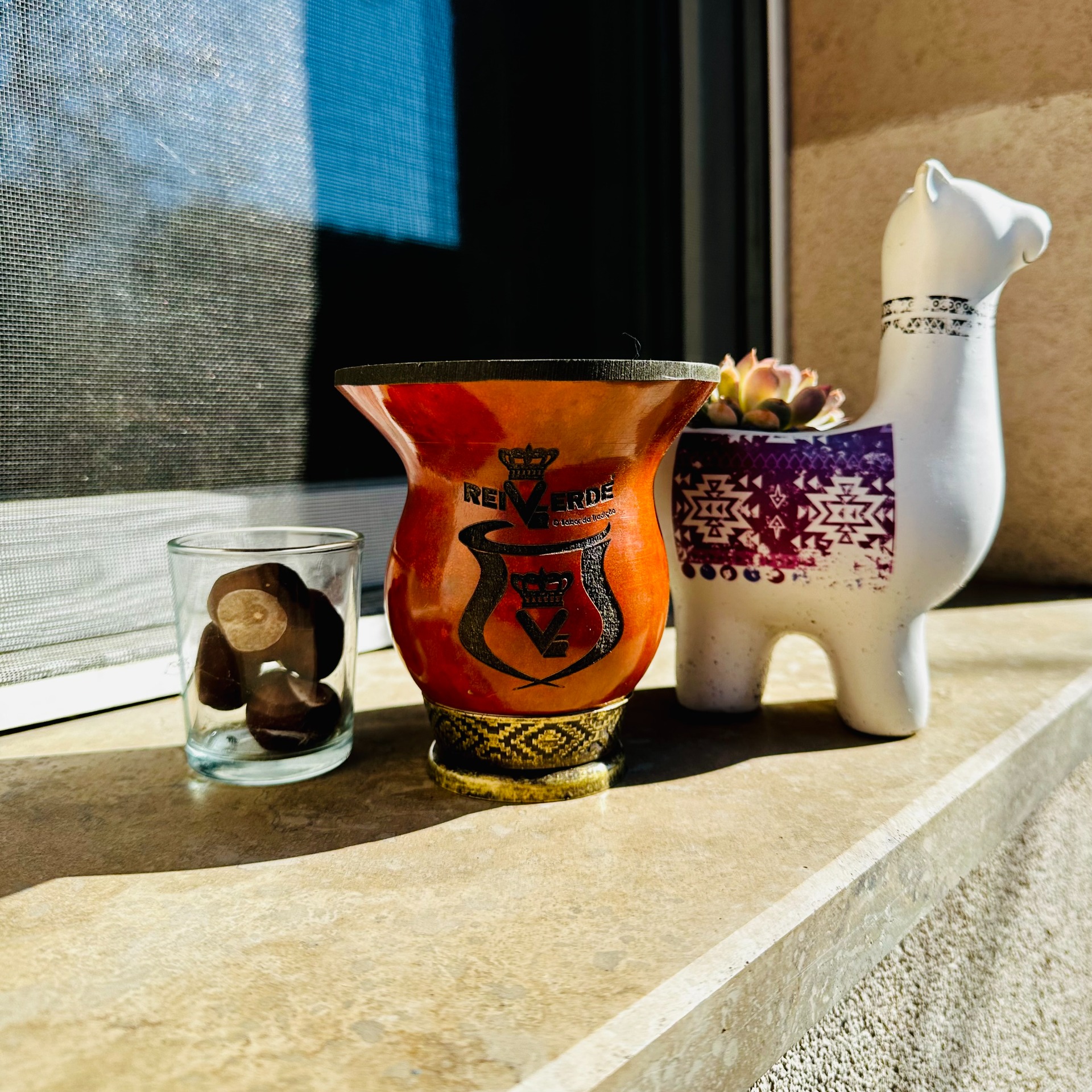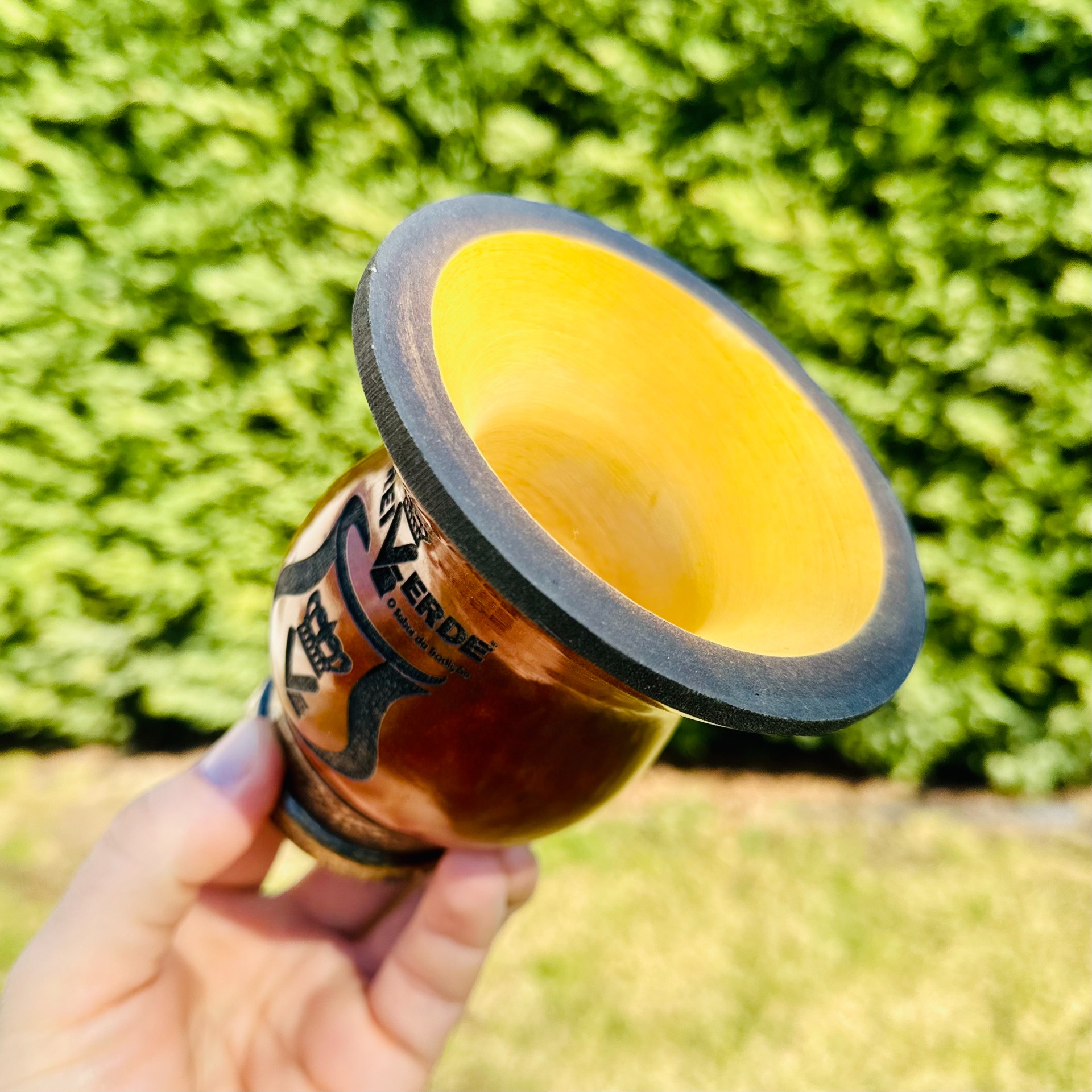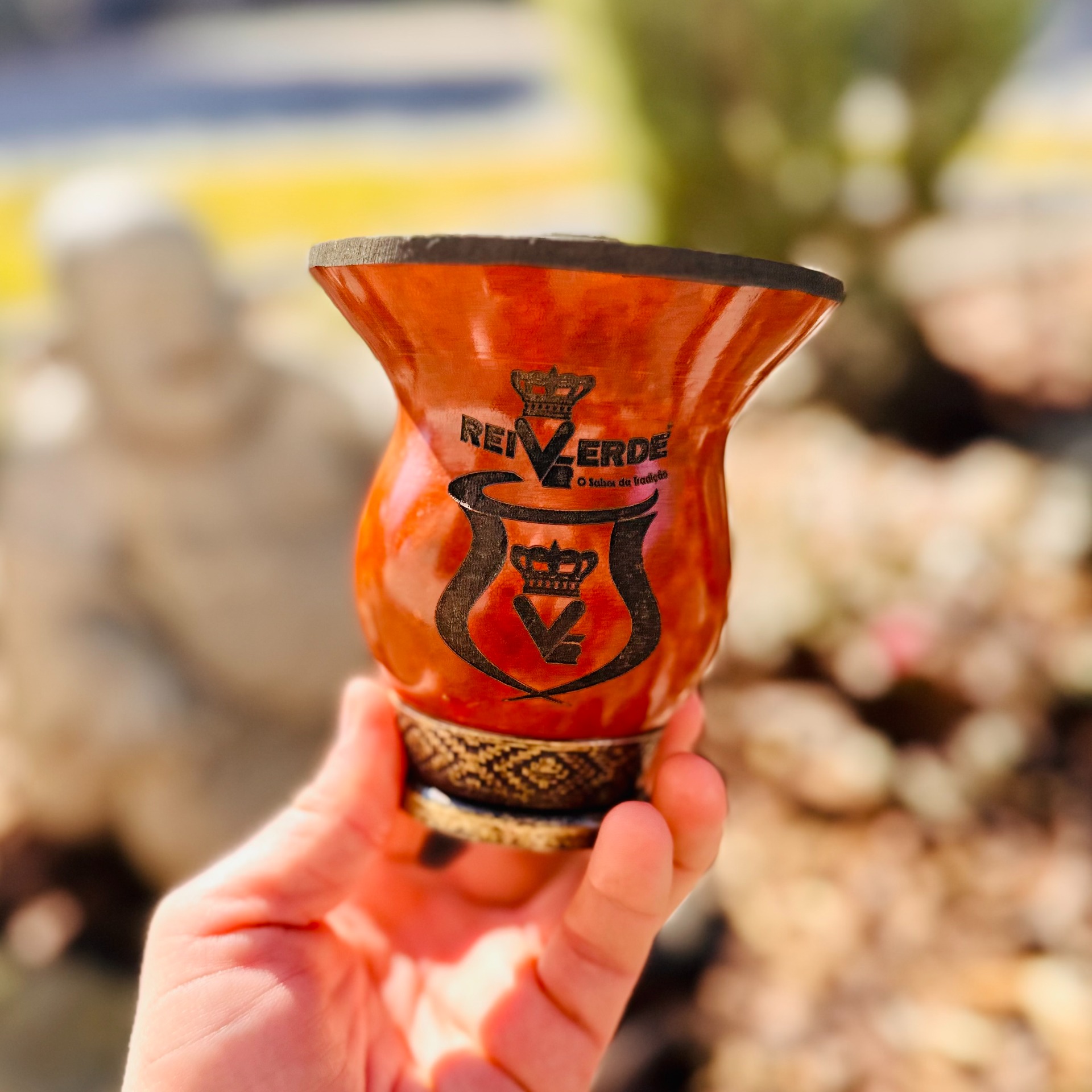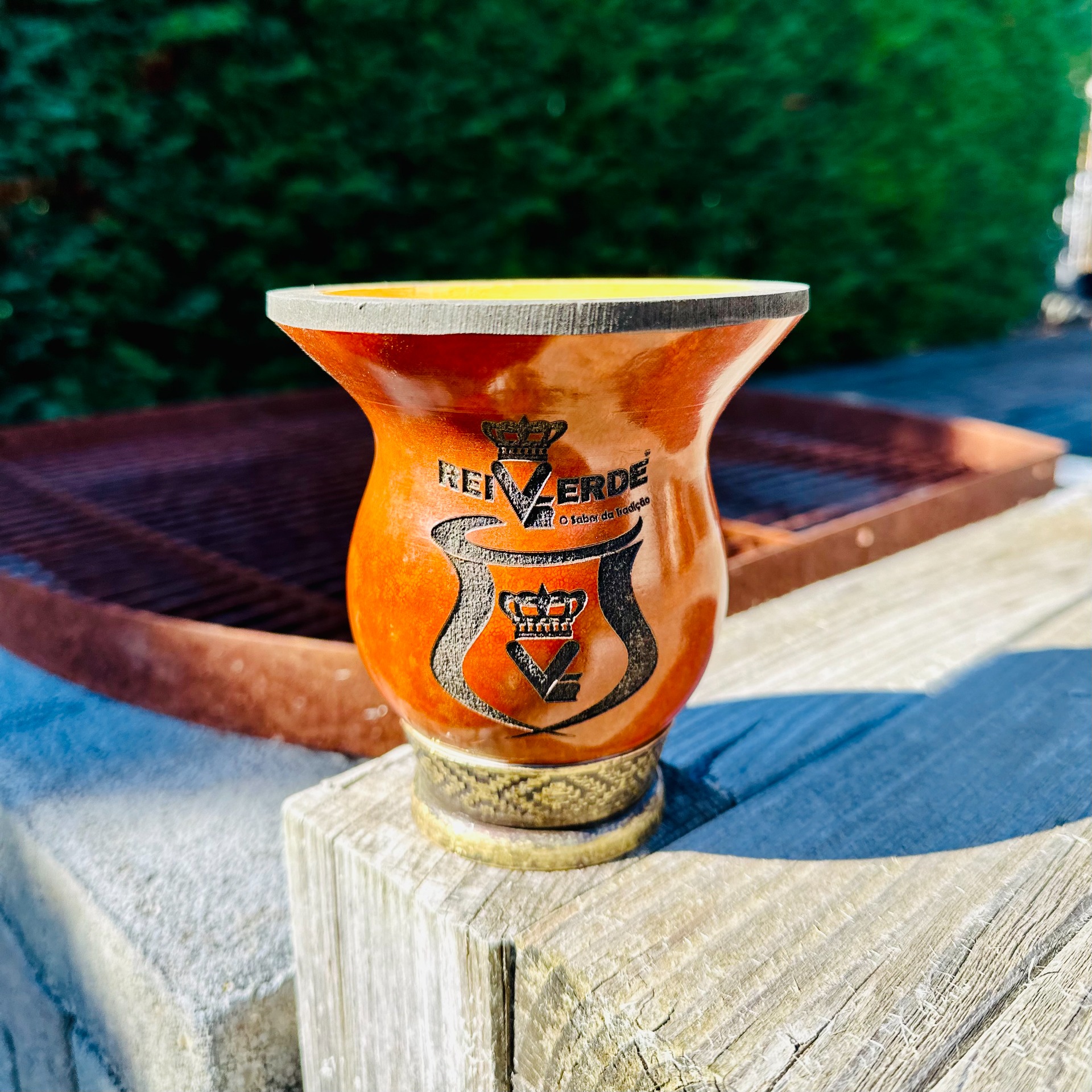 Ez a homokóra formájú Rei Verde Cuia vastag héjú tökből készült, stabil, díszített fém talppal. A Chimarrão nagy szerelmeseinek örömére, gondosan megalkotott, klasszikus déli formavilággal, és a márka égetett logójával ellátott egyedi darab – igazi különlegesség a materók számára!©